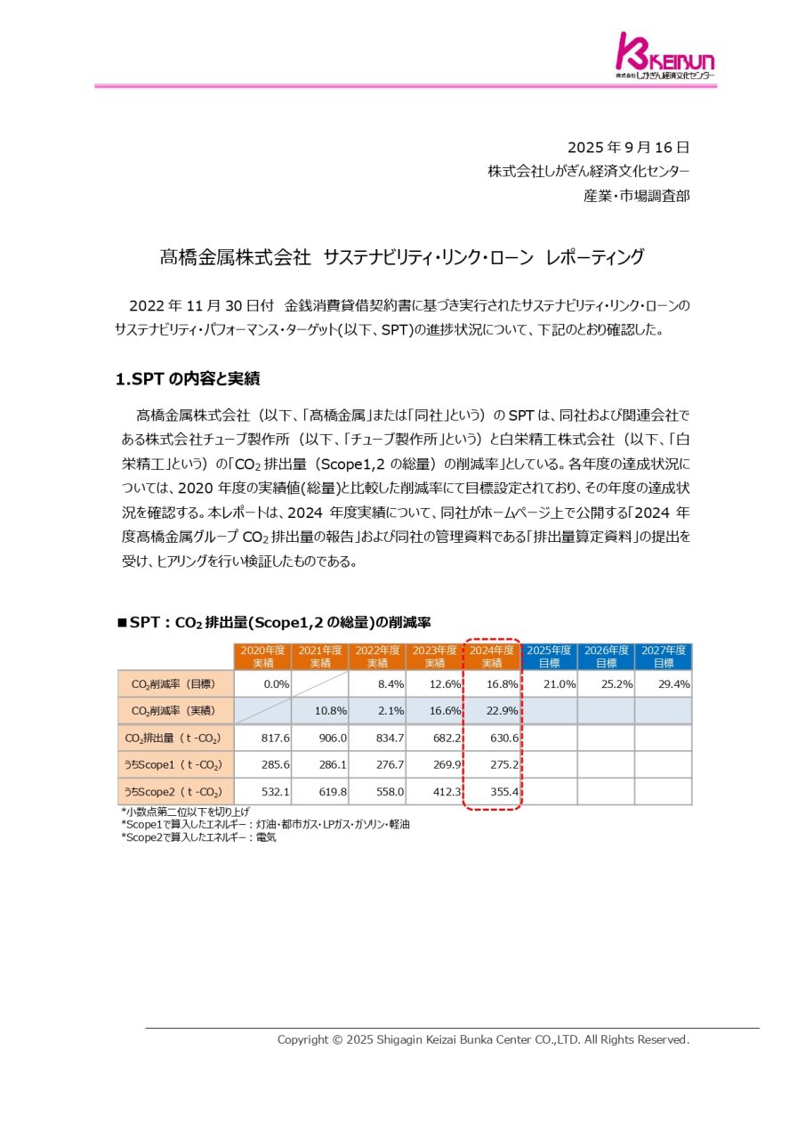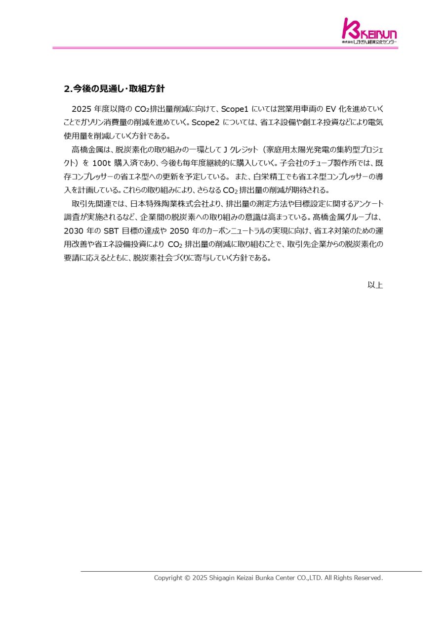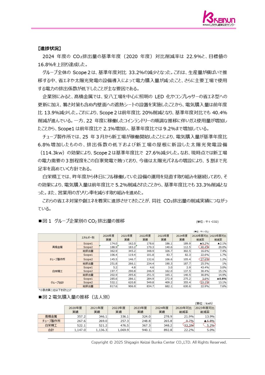 当社グループ(髙橋金属、チューブ製作所、白栄精工)の2024年度(2024年7月~2025年6月)のCO2排出量及び電力の使用量は下記の通りとなりましたのでご報告いたします。